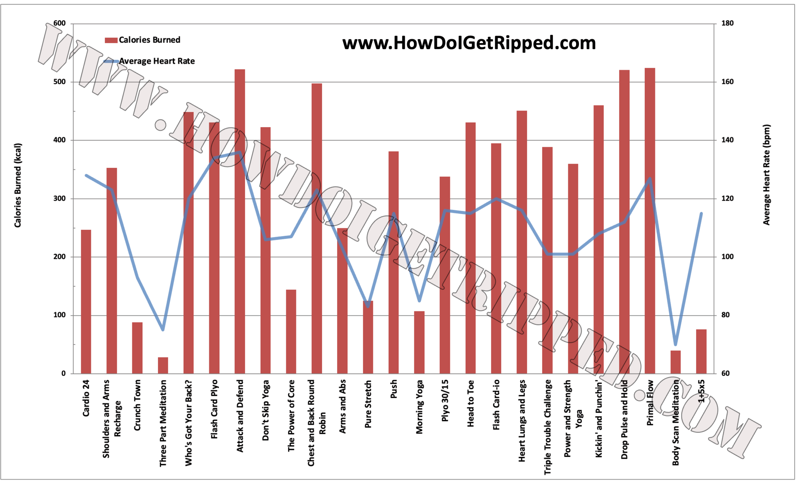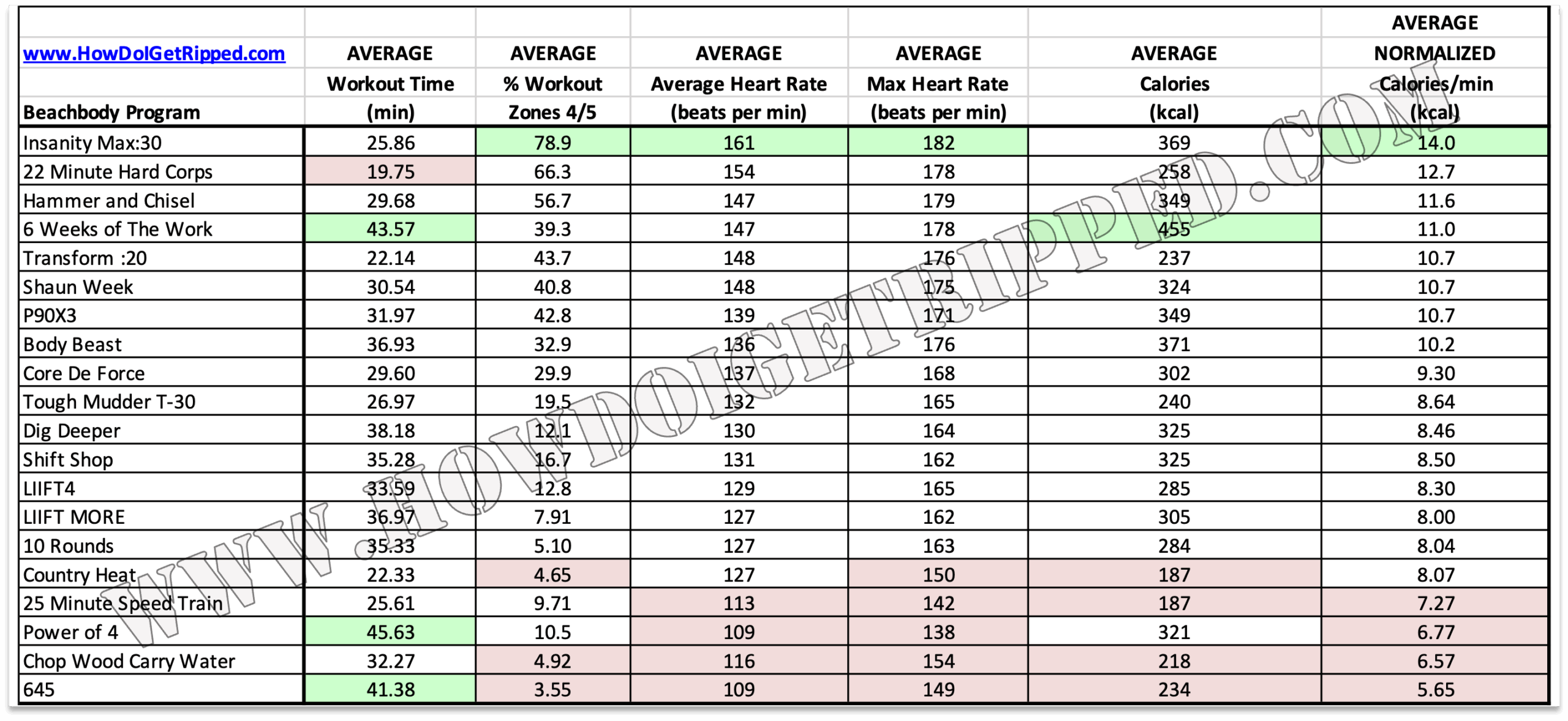Check out the comparison below to some key performance indicators relative to other top Beachbody programs P90X3, Insanity Max:30, Hammer & Chisel, 22 Minute Hard Corps, Body Beast, Country Heat, Core De Force, Shaun Week, Shift Shop, LIIFT4, Transform :20, 6 Weeks of The Work, 10 Rounds, 645, LIIFT MORE, Tough Mudder T-Minus 30, Chop Wood Carry Water, Dig Deeper, and 25 Minute Speed Train (click to expand for easier reading). Numbers shown are averages of all 16 Insanity Max:30 workouts, all 20 P90X3 workouts, all 19 Hammer and Chisel, all 13 22 Minute Hard Corps workouts, all 15 Body Beast workouts, all 11 Country Heat workouts, all 14 Core De Force, all 7 Shaun Week workouts, all 11 Shift Shop workouts, all 34 LIIFT4 workouts (excluding B4 LIIFT4), all 51 Transform :20 workouts, all 33 10 Rounds workouts, all 90 645 workouts, all 52 LIIFT MORE workouts, all 24 Tough Mudder T-Minus 30 workouts, all 24 Chop Wood Carry Water workouts, all 24 Dig Deeper workouts, and all 51 25 Minute Speed Train workouts relative to all 25 Power of 4 workouts. Workout times generally average in the 30-35 minute range for most of the programs compared to the longer ave. 45-min range for Power of 4, as designed.