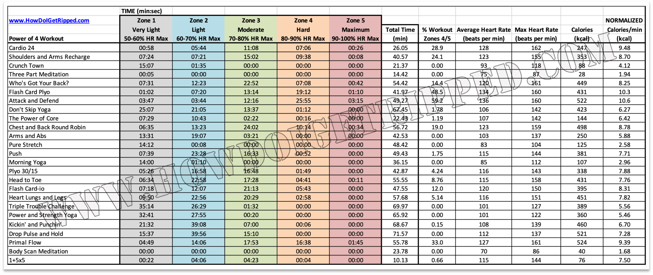 You can see from the data set that Power of 4 provides a range of intermediate to entry level workouts that challenge in different ways. (By the way, I know that you are not actually “burning” calories, ha, it is just a term like “expenditure”.) Based on my data I get an average calorie burn of 321 cals/workout over the 25 Power of 4 workouts, which is mostly due to the longer workout duration than actual intensity. The average % of workout in the upper zones 4/5 and average normalized calories are lower as well, as expected. There are a lot of lower impact movements that reduce the time in elevated heart rate zones. Further, the extended breaks I mentioned in the CONS section provide time for heart rate to recover while the meditation and stretch routines reside in the lower zones 0-1. The heart rate data confirms some of the plyo, primal, and martial arts routines were (by far) the most challenging in the entire program.