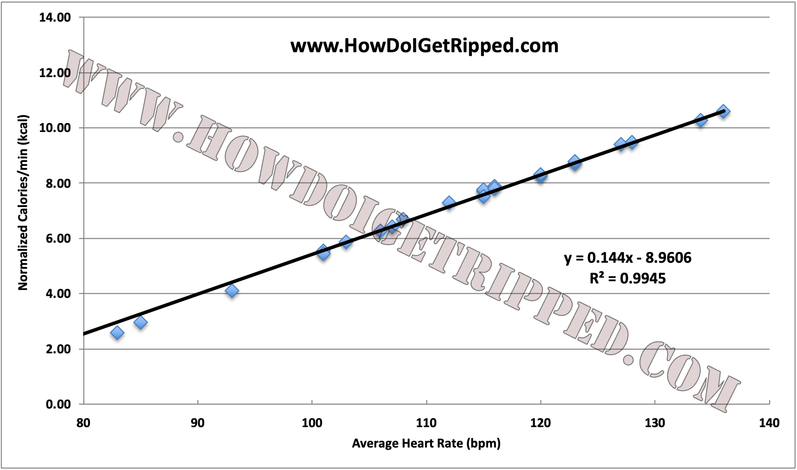 I feel really good about the data set and the regression analysis below indicates a very strong correlation to the data set for normalized calories and heart rates, which is a good sign (very close to perfect correlation R2 = 1). Although not shown in graphical format, max heart rates vs. average heart rates for all 25 Power of 4 workouts actually provides a good fit at y = 1.2462x + 2.2528 (R2 = 0.9315).